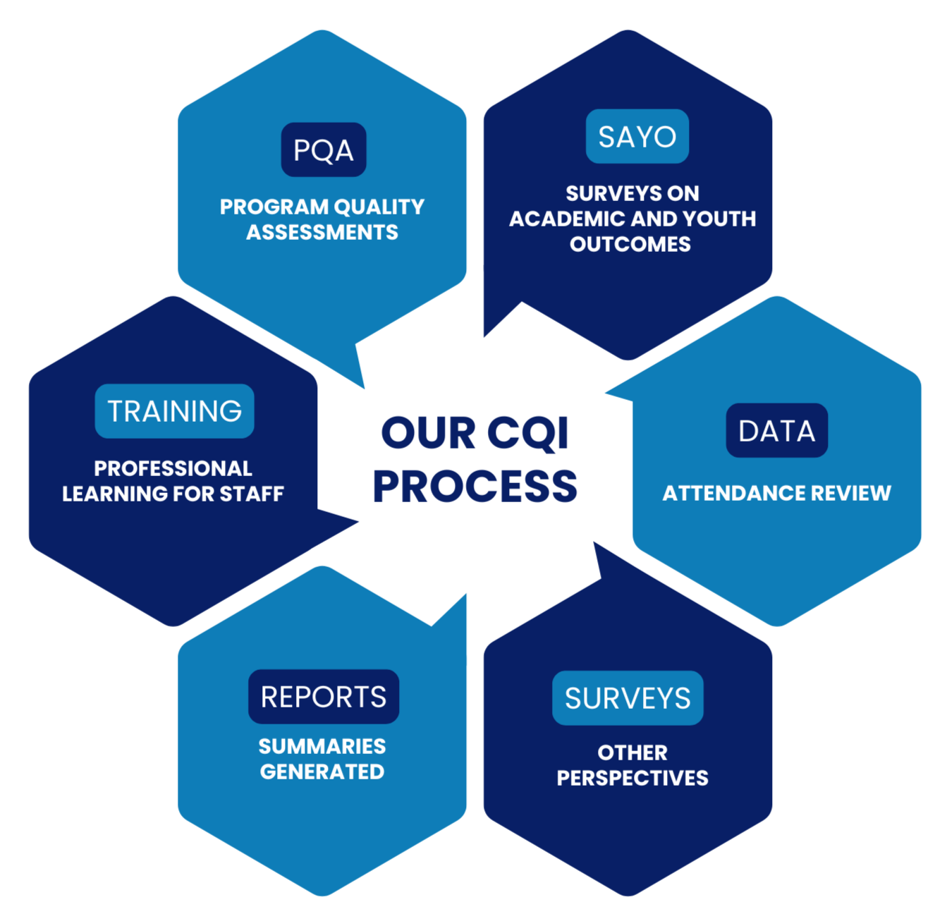 Our Continuous Quality Improvement (CQI) process is a four-pronged framework for youth-serving organizations to partner with The Opp to assess and improve program quality. Partners may opt into any of the four parts of the program and are encouraged to complete this framework annually to strengthen quality improvement.